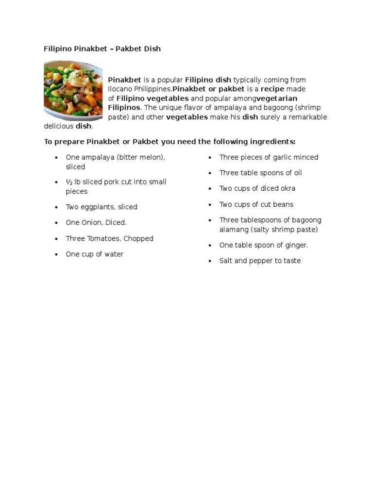 Pakbet Ilocano Recipe from panlasangpinoy.com Here we go again with a new and full of veggie recipe. A dish that is very popular among ilocanos just like my husband.he sur. What's the best way to make a pinakbet? You can dilute the bagoong with water to balance the saltiness and the aroma. What's the best way to make pinakbet soup? Toss in the tomatoes, sugar,. Jun 04, 2020 · cooking the pinakbet download article 1. What's the best way to cook pinakbet pork?
